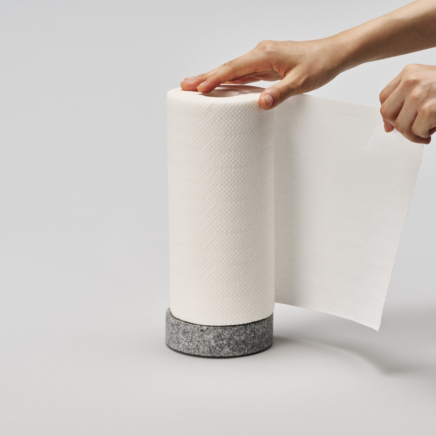 This paper roll stand is a combination of stone and wood. The center of gravity is stabilized by using a stone as a base, and even when paper is pulled out the structure is designed to prevent it from falling over.